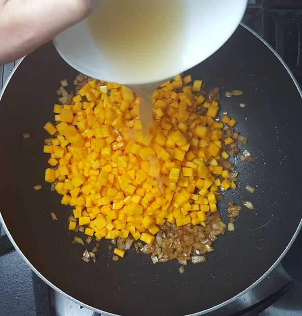 Añadir la calabaza y el caldo, revuelva para cubrir la calabaza.
