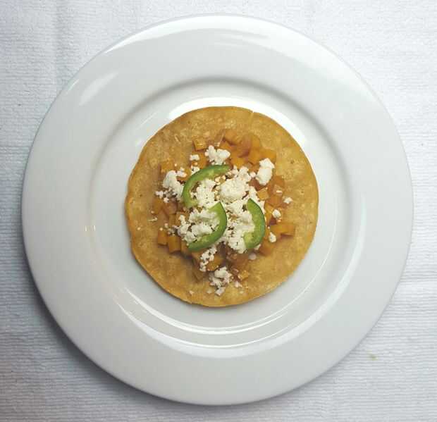 Arme los tacos de relleno las tortillas con la mezcla de calabaza y guarnición con el queso fresco, chiles jalapeños y otros ingredientes de su elección.