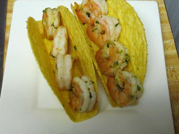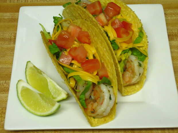 3. caliente cáscaras del taco en el horno si desean. Montar tacos con camarones, lechuga, queso y tomates. ¡ Disfrute!