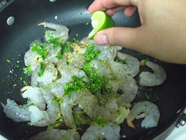 2. reducir el fuego a medio y agregar los camarones, sal, pimienta, cilantro y jugo exprimido de 1-2 rodajas de limón. Cocinar hasta que el camarón se lleva a cabo y saque rápidamente del fogón. (Esto evita que el camarón sigan cocinándose y goma).