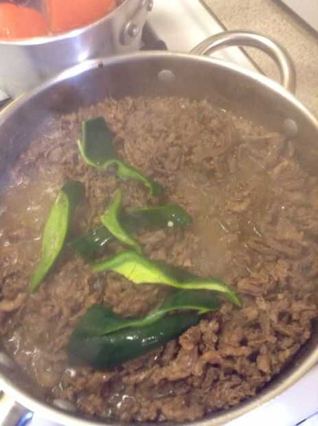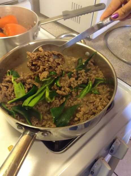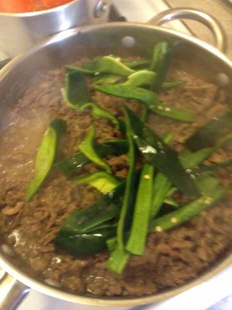 Después de 30 minutos de cocción de la carne, añadir los trozos de Chile poblano a la carne.
