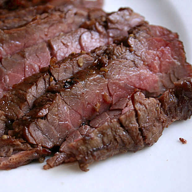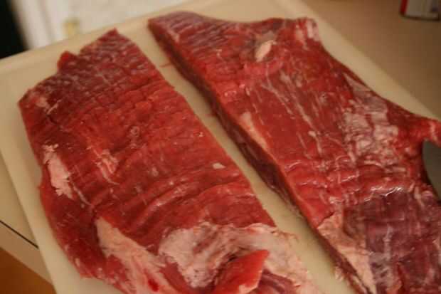 Coloque el flanco sobre una tabla de cortar. Es un colgajo muy amplio de carne, y será difícil de maniobrar en el asador en esta forma. Cortar por la mitad a lo largo del grano - hacia abajo en el centro, y tendrás dos mitades.