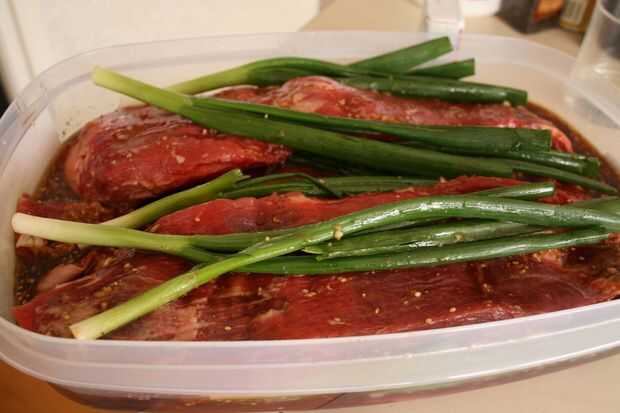 1 manojo de cebolletas, lavar y enjuagar bien. (Esto simplemente agregará entre la carne de vacuno más adelante para la capa final de sabor. Utilizado para picar cebolla de verdeo en el adobo, pero acabaría con demasiados trozos carbonizados de vieras que no era ese apetitoso. Si no tienes cebolla de verdeo, no dude en tirar algunos gajos de cebolla blanca con la carne de res después de adobar.)