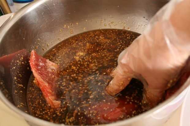 Mojar cada pieza de carne en el adobo, asegurándose de sumergir y cubrir todos los lados de la misma. (Llevo un guante desechable porque aceite de sésamo y salsa de soja hace que tu mano huele para siempre). Retirar del adobo y colocar en recipientes de almacenamiento.