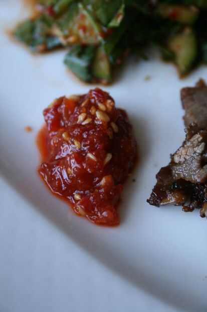 1/4 taza Sambal Oelek con ajo (o chiles de tierra roja - disponibles en el mercado chino - super caliente) 1 cucharada de aceite de sésamo semillas de sésamo 1 cucharada