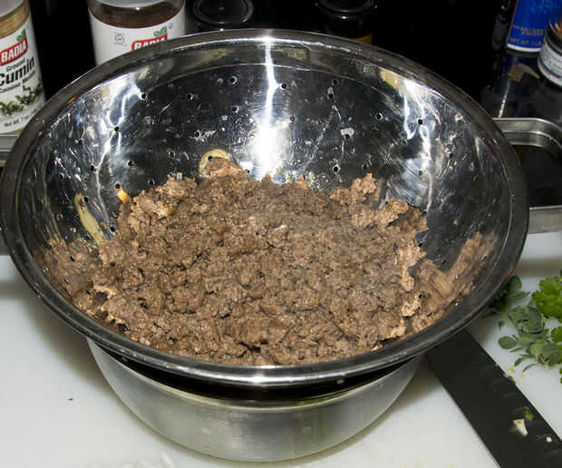 Cuando estén dorados, use una cuchara ranurada para transferir la carne a un colador en un cuenco donde puede drenar.