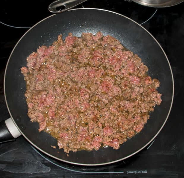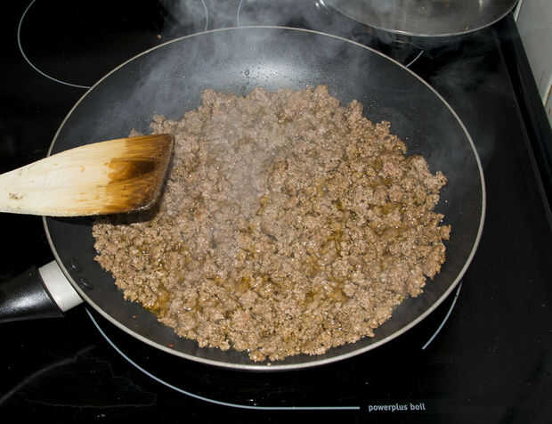 Calentar una sartén a medio. Si yo estoy cocinando más de 1 libra de esto, yo uso una sartén de fondo pesado grande de acero inoxidable. Por una libra, esta uno antiadherente funciona bien. Si usas una olla de acero, golpeó con aerosol de cocina antiadherente antes de agregar la carne.