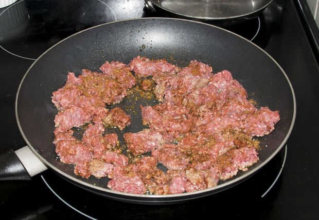Añadir la carne molida a la sartén caliente y espolvoree con cerca de un tercio de la mezcla de especias. Dora la carne, unos 15-20 minutos, continuar romper con una espátula.