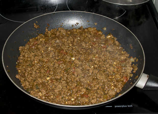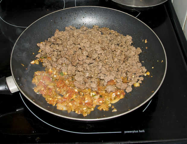 Agregar que la carne molida de drenaje hacia la bandeja. Mezclar con las verduras y añadir el resto de la mezcla de especias a la sartén. Cocinar durante 5 minutos.