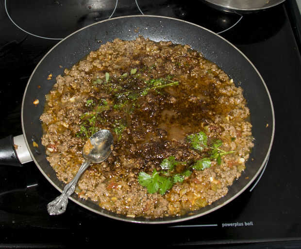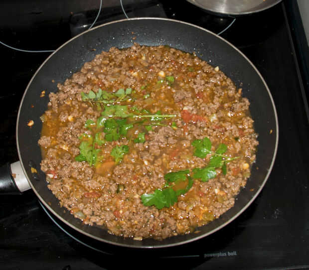 Añadir el caldo de carne junto con las ramitas de cilantro y orégano. Cocinar durante un par de minutos y empezar a probar. Después de que hayas hecho unas cuantas veces, usted puede comenzar a oler cuando la mezcla es correcta - si huele a hamburguesa de cocina, añadir otra cucharada de polvo de Chile genérico. Terminé añadiendo dos cucharadas más de genérico Chile en polvo. Cuando es derecho, tiene un tono distintamente rojizo a él.