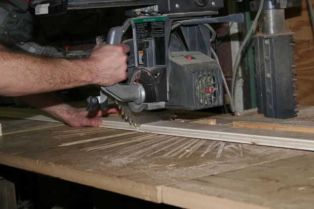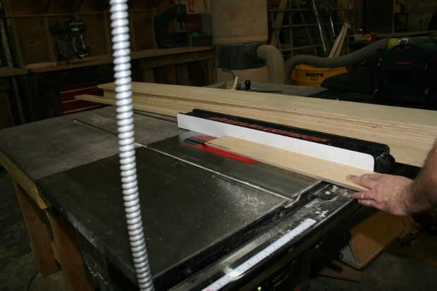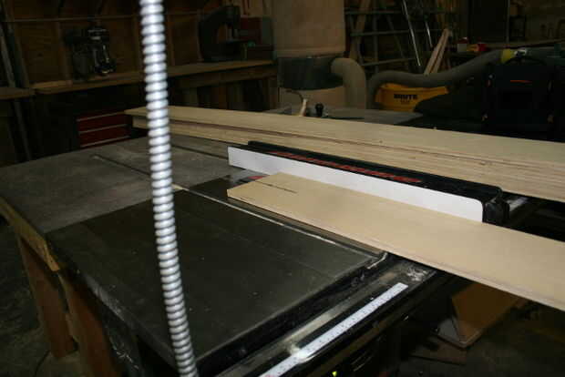 Por lo tanto, de una hoja de contrachapado de abedul de 3/4", procedí a cortar mis calas. Comencé por rasgando tiras de 7-3/4, así que yo tendría algo un poco más, al final, y todas las 6 piezas tendría idéntica anchura.