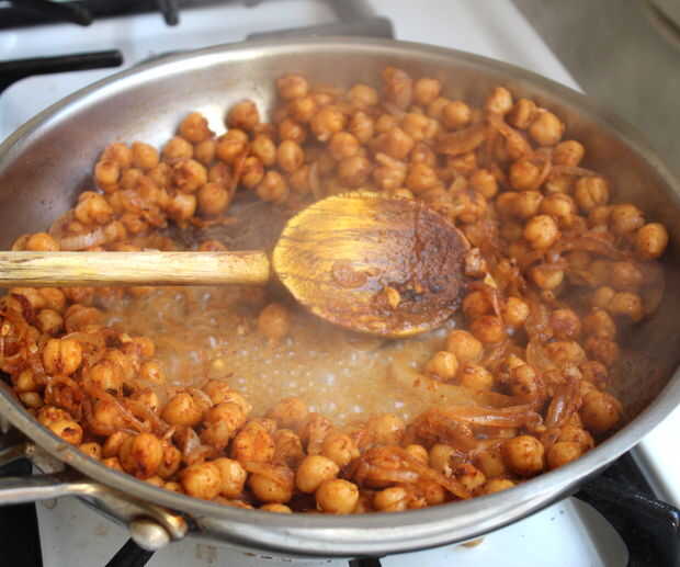 En este punto, usted va a Desglasar la sartén con el jugo de la mitad de un limón y una cucharada más o menos de agua. Raspar las sabrosas especias y cebollas que son probablemente un poco pegado a la parte inferior. : D