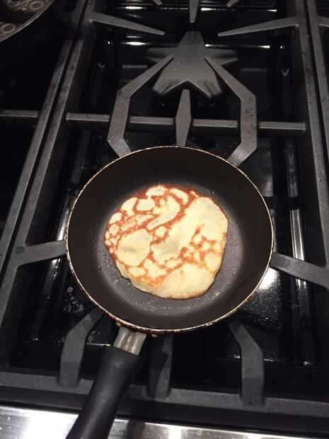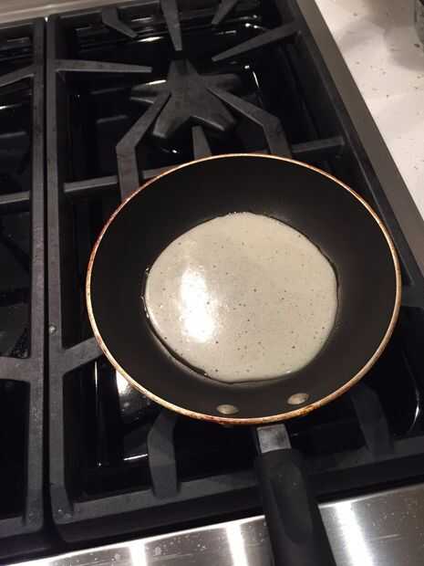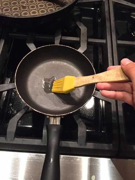 Aceite de la sartén y vierta aproximadamente 1/4 taza de la masa y rápidamente agitar la cacerola para que la masa cubre la parte inferior entera de la cacerola.