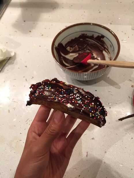 Eliminar un taco del congelador y cubrir la parte media con ganache. Rápidamente añadir sprinkles en la parte superior, si lo desea y volver a taco en el congelador.