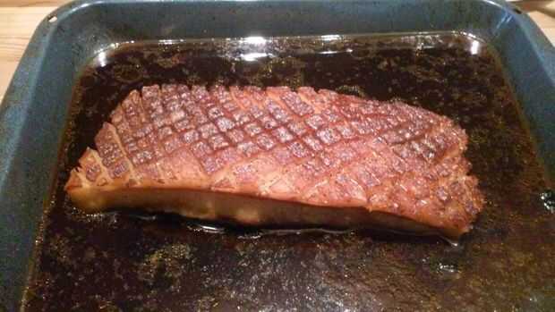 Quería la temperatura rondando alrededor de este punto durante el mayor tiempo posible de colágeno en los tejidos conectivos para romper, así que baja el horno a 195 grados Fahrenheit y había colocado el vientre en el horno por 90 minutos. También he añadido otra 1,5 tazas de agua a la cacerola.