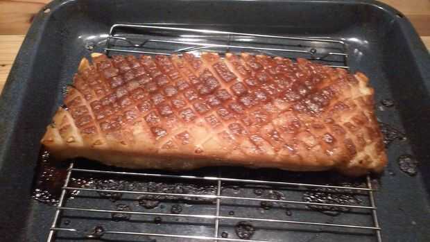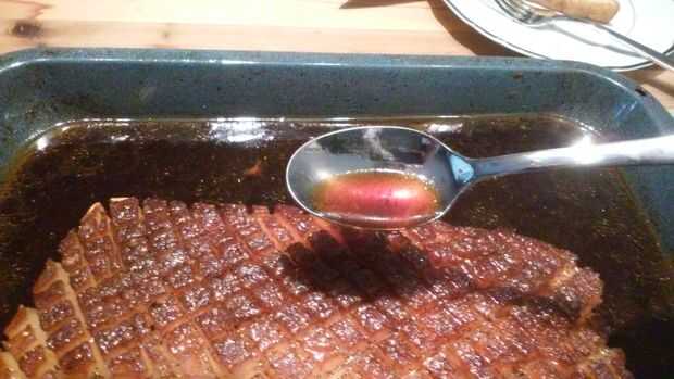 Ahora llegó el momento de procesar la grasa un poco. Levanté la temperatura hasta 350 grados Fahrenheit y retirar la rejilla. Quería que cuece en su líquido. Después de 30 minutos, me voltea la piel del vientre abajo y agrega 2 tazas de agua y 1 taza de vinagre de sidra. Después de eso, de nuevo en el horno durante 60 minutos.