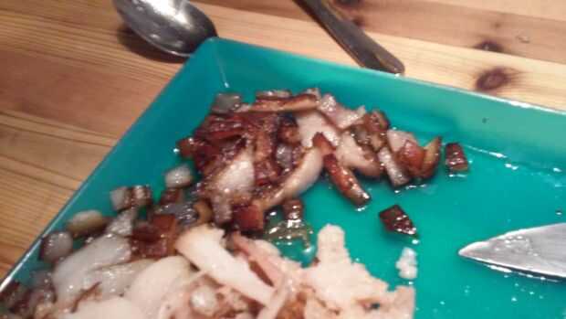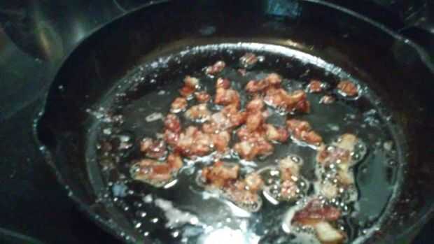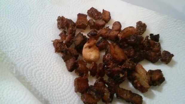 En vez de gastar la piel y la grasa tapa, decidí hacer chicharrones (también conocido como Bacon) simplemente de freír los pedazos de piel en la grasa hasta que empezaron a estallar como palomitas de maíz de cerdo. Estos pueden ser comidos como son o agregados al frijol/sopas para agregar sabor.