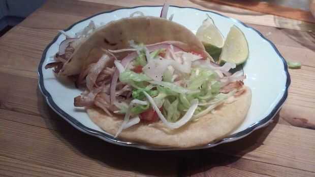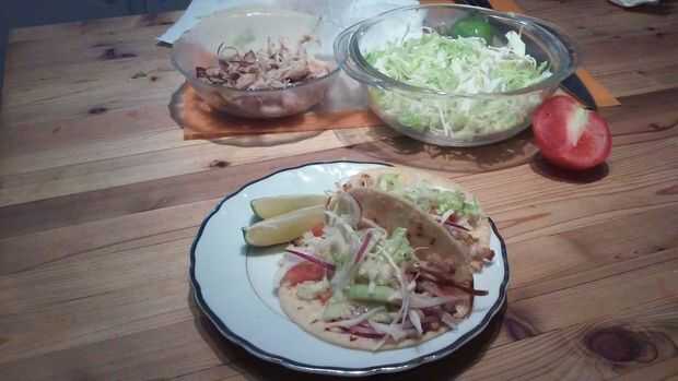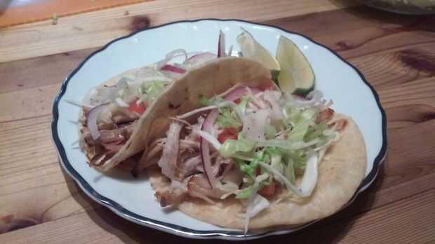 Me calienta unas tortillas de maíz en una sartén de hierro y había les había cargado con tiras de panceta, repollo rallado y lechuga, cebollas y tomates. Con un toque de Lima fresca estaban deliciosos!