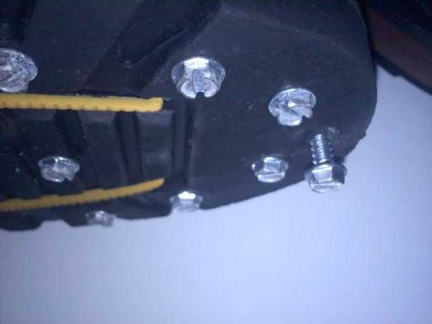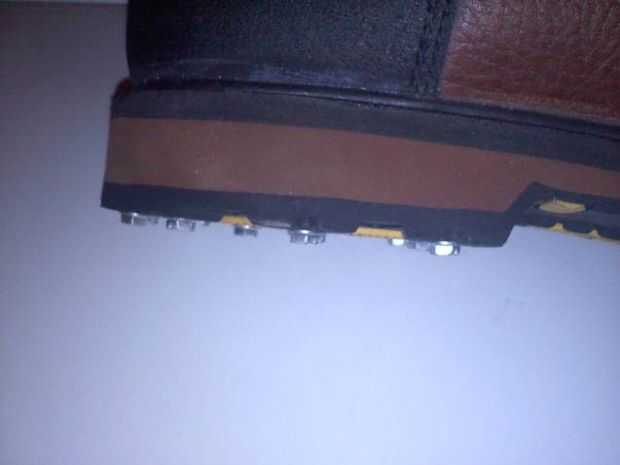 De cabeza hexagonal tornillos (los que tienen ranura para el destornillador funcionan mejor) de una longitud apropiada para el espesor suela de sus botas, en este caso utilicé 5/8" largo