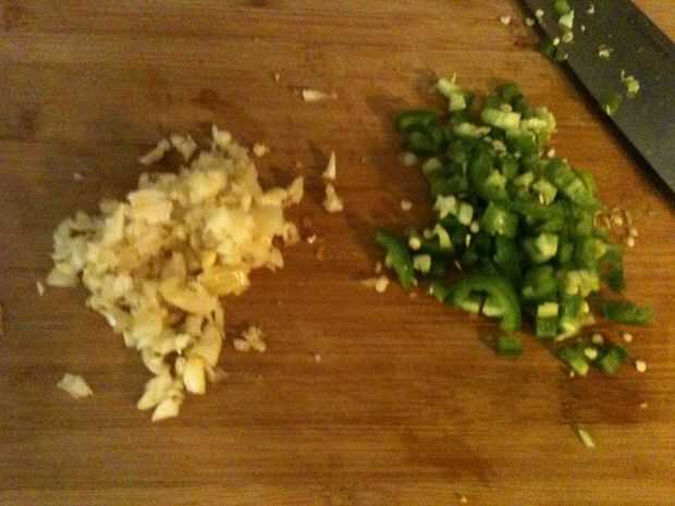 Comience por picar ajo y pimienta jalapeño al gusto - me gusta un montón de ajo y una cantidad media de picante.
