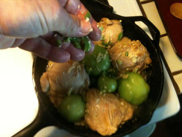 Cuando los muslos de pollo estén dorados por un lado, la vuelta les y Desglasar la sartén otra vez. Luego agregar los tomatillos - usar al menos uno por cada pieza de pollo, tal vez un poco más. Agregue ajo y jalapeños, rociar sobre el pollo para que no se queme.