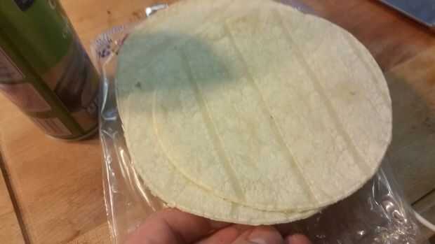 De todos modos... Tomar 2 tortillas juntos. Rociar la sartén con aerosol de cocina. Armar la tortilla en la sartén. Rocíe la parte superior de la segunda inmediatamente. Esto atrapa la humedad y se unen las 2 tortillas.