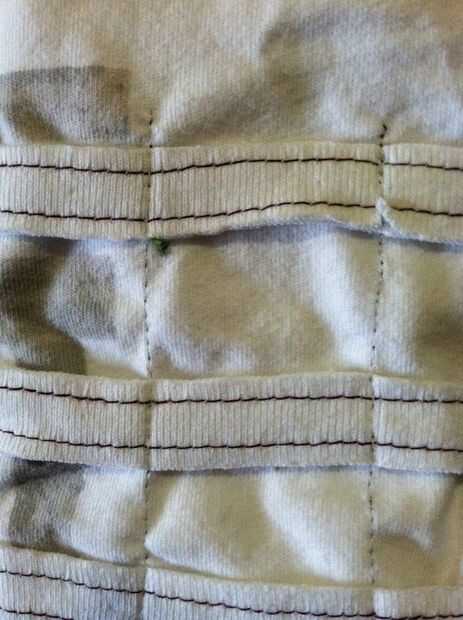 dejar de lado los dos cargadores más cortos que no hem. a coser las correas molle por solamente la capa externa. la capa interna protege y cubre la parte posterior de su trabajo cosido de enganches como alguien llega con entusiasmo dentro de la media. también conserva la forma. porque material de camiseta tiene mucho de dar, si llenan con dulces y regalos, sag sin la capa adicional. así, para las bandas de molle en la espalda, corte un manguito, cortada a lo largo de la costura abierta y abrió en un rectángulo. Dio un buen tirón para que relaja. Me cosió a lo largo de la longitud del rectángulo, dado vuelta a la tela y había cosido el vestido otra vez, con aproximadamente la mitad de una pulgada de espacio entre cada fila. entonces yo cortar entre las filas para que cada correa tenía dos bordes cosidos. precisar estas como quieras. luego coser verticalmente a través de ellas, todo en un golpe, de una pulgada o más entre los lazos.