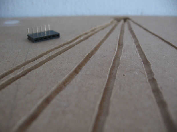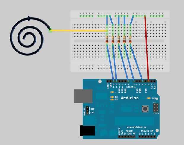 El circuito electrónico se puede encontrar en la imagen, el sensor es un cable de cobre espiral (sólo se muestra para la simplicidad). Sensibilidad es controlada por las resistencias encontradas antes de cada pin. Puede van de 1 MegaOhm (tacto absoluto) a 40 MegaOhm (12-24 pulgadas lejos) dependiendo si es absoluta o es necesario toque cerca (terminé usando resistencias de 2M Ohm). Experimento con los valores hasta que el sensor se comporta como deseado. Es una buena idea instalar cierta superficie conductora (separados por una delgada pieza no conductoras) conectado a tierra de los circuitos en la parte posterior de cada espiral. De esta manera los sensores será más estables y menos influenciado por el ruido.