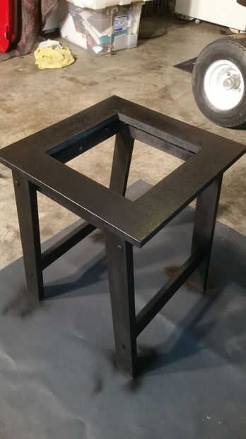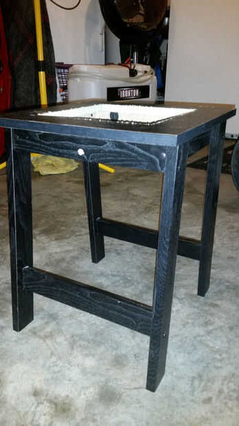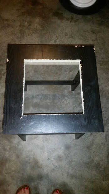 El siguiente paso fue hacer un agujero cuadrado en la parte superior de la mesa y luego aerosol pintado negro mate toda la tabla. También perforé un asimiento en el lado de la mesa para que el cable de poder ir más adelante.