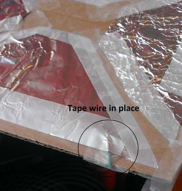 El primer paso es insertar un alambre de 8-10cm entre la lámina y el cartón y cinta adhesiva en su lugar. Repita para cada