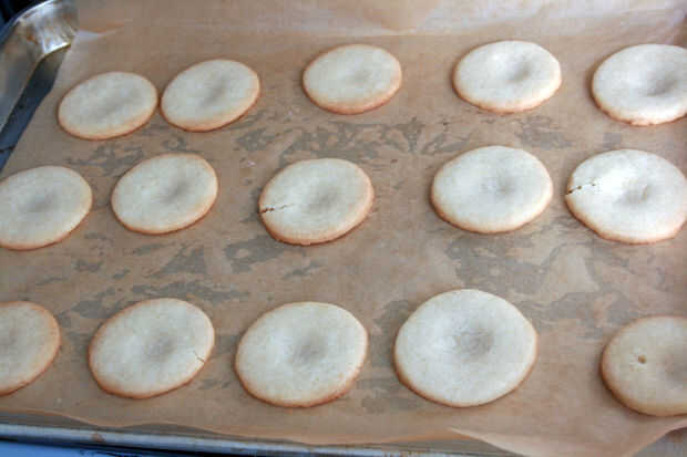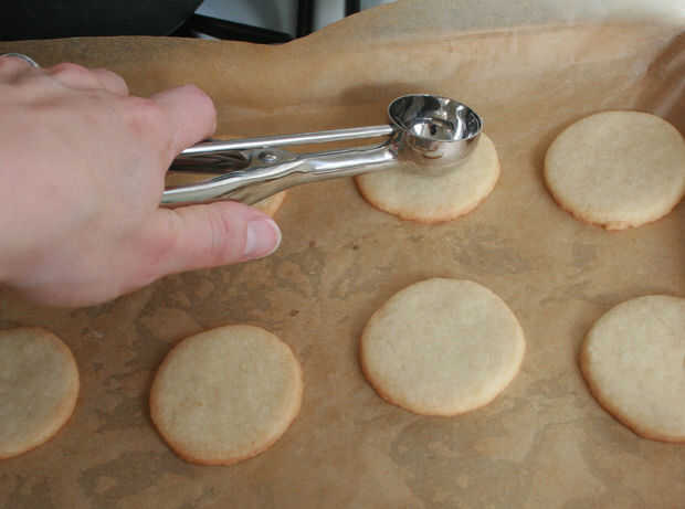 Con una cuchara, cucharada, o el pulgar, haga una marca en el centro de cada galleta. Este es el pozo para mantequilla de maní relleno bondad. Hazlo antes de que enfríe!