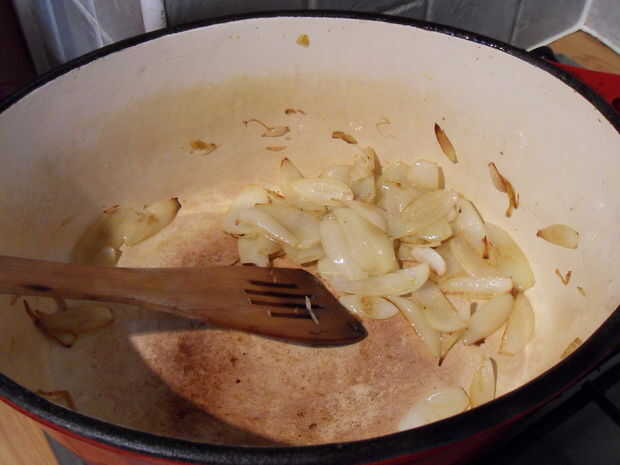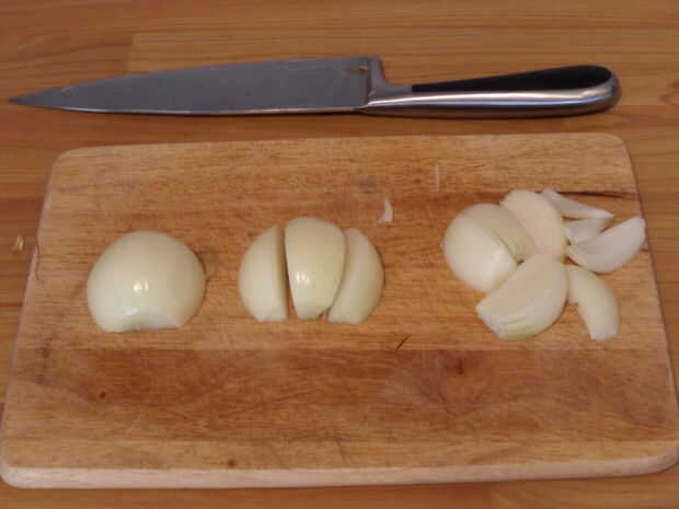 Pelar la cebolla, cortar en mitad y en rodajas, 6 o 8 por cebolla. Echar en la sartén y freír hasta que se ablanden (no doradas).