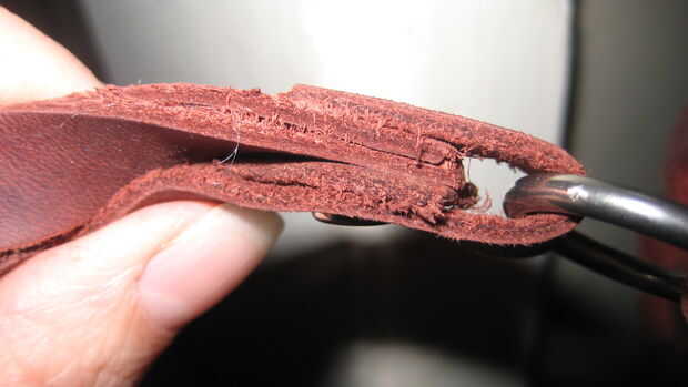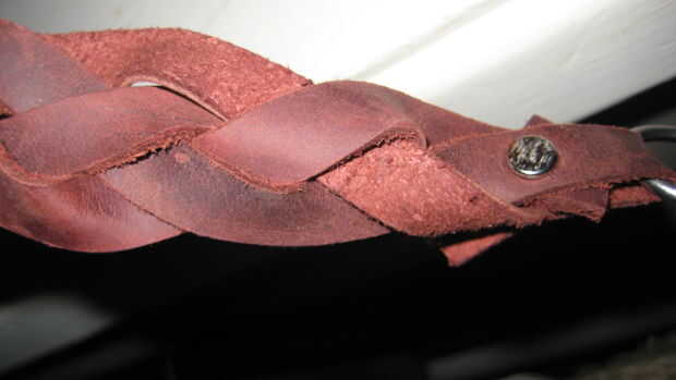 4 de las correas de cuero y los Alinee uniformemente uno encima del otro. Tire de la tira superior por lo que es más alto que los otros tres cerca de 1 pulgada. perforar un agujero a través de todo 4 y entonces un agujero más en la banda superior en la parte superior. (esta pieza va a lazo de las otras y fijar alrededor de un anillo) Una vez que el tirantes, puede empezar la trenza. una vez terminada su trenza, repita la fijación en el otro aro.