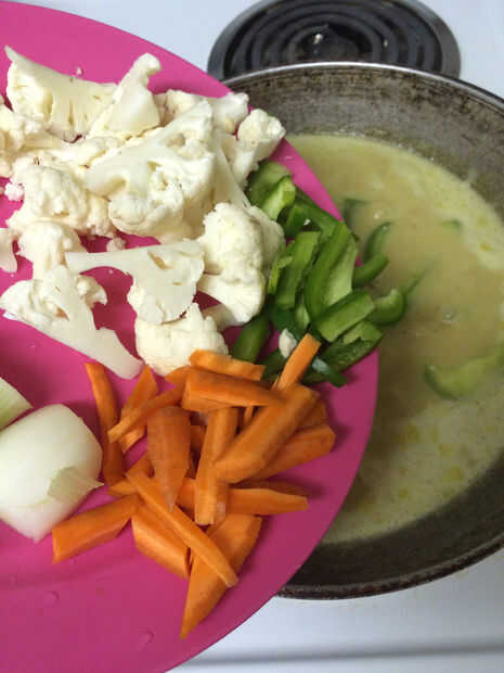rojo curry con pollo y verduras es fácil cuando empiezas con la pasta de curry comprado. Perfecto para el almuerzo del día rojo.No es realmente hacer trampa con pasta de curry rojo - que lo verdadero consiste en ingredientes es poco probable que teng