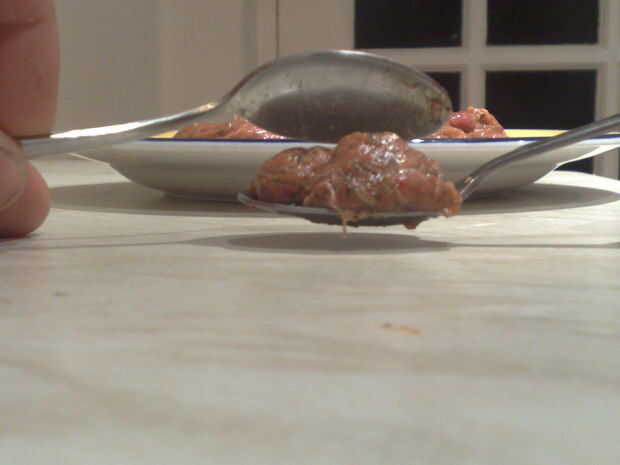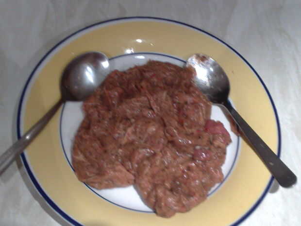 Si usted confió en nuestra pequeña chum eggy, la carne debe ser como una pasta muy espesa que es un poco difícil de convencer de la licuadora. Agitar en un plato y dejar el desorden (¡ buen trabajo prestado la licuadora!).