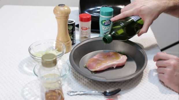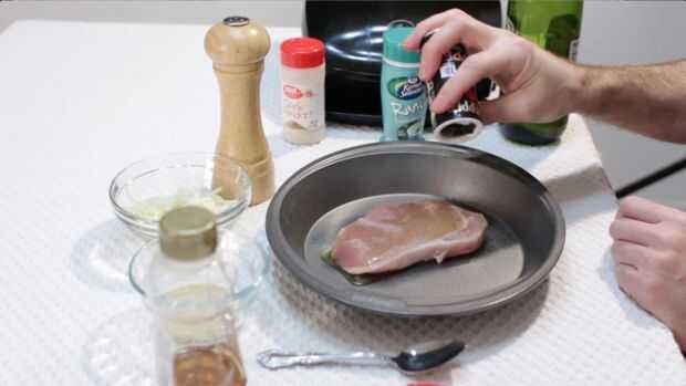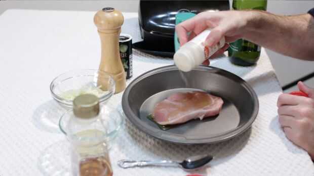 Ahora vamos a tomar nuestra chuleta de lomo de cerdo y prepararla. Primero vamos a rociar el aceite de oliva. Acaba siendo aproximadamente 1 cucharada. Pero usted no tiene que ser exacta. Luego agitar en algunos ajo en polvo, pimienta, sal y luego voltéela, para que se pone el condimento en el otro lado, usted puede siempre agregar más si quieres. Tienden a añadir un poco más en el plato y luego a moverlo y consigue un montón de especias en él.
