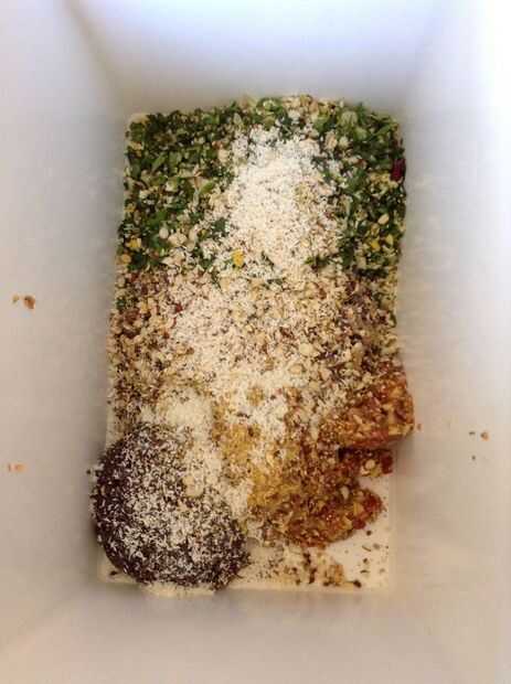 Usar un recipiente grande. Añadir los otros ingredientes secos en este punto como pedazos de nuez, coco y almendras fileteadas.