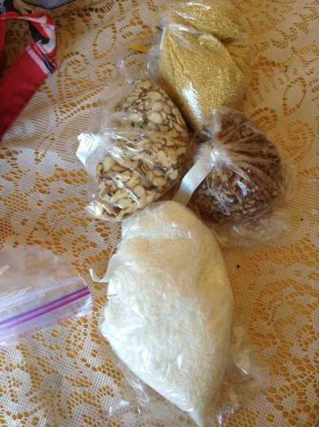 Verduras frescas, fruta, granos, frijoles, lentejas, especias, semillas de chia, semillas de lino y todo lo que puede ser no tóxico a aves. Fondo Lave cualquier producto y recoger a través de frijoles y granos de piedras. Para esta chuleta, estamos utilizando: adzuki, frijoles, frijol orca, amaranto, kamut, lentejas, quiona, arroz couscous, arroz dulce negro, semilla de Chía, semilla de lino, espinaca, hinojo, acelgas, calabaza de verano, snap peas, mango, pomello rosa, fresas, plátano, albaricoques, manzana, coco seco, pedazos de nuez, almendras rebanadas y avena.