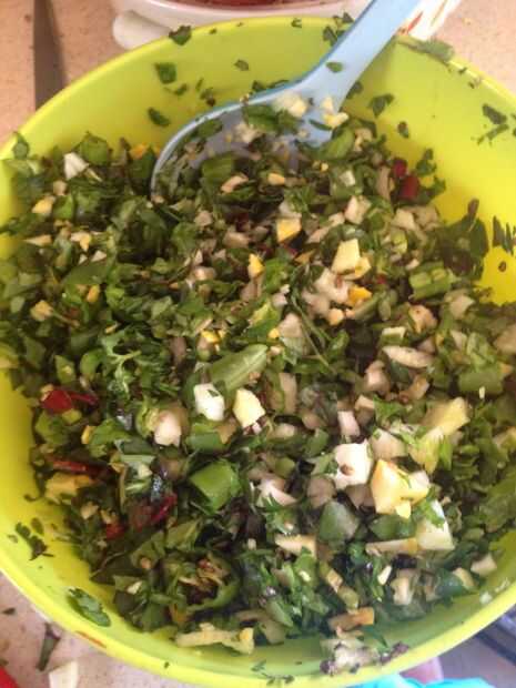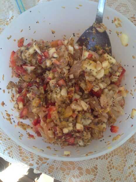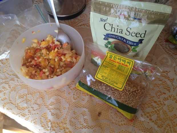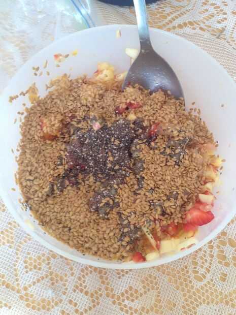 En recipientes separados para frutas y verduras, mezclarlas. Ya que estará esperando los frijoles y los granos en remojo, lo mejor es almacenar en recipientes que caben en tu nevera. En este paso, añadir semillas de lino y chia a mi mix de frutas para absorber la humedad.