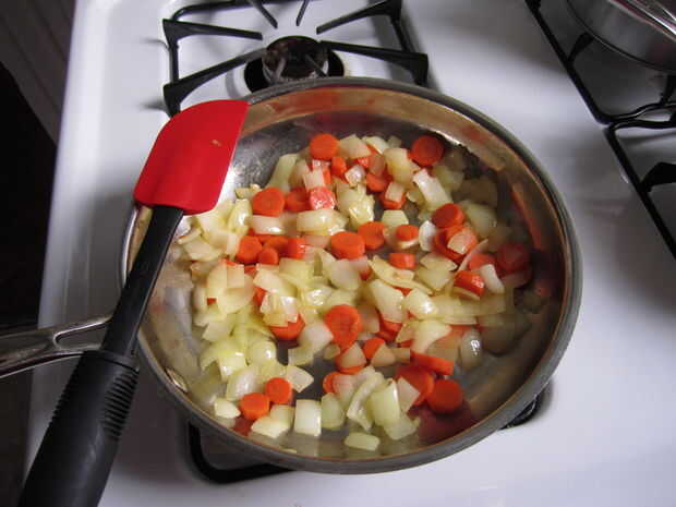 Poner un poco de aceite de oliva en el sartén sobre fuego medio y volcado en las verduras. Dejarlos cocinar por unos minutos, o hasta que el haz transparentes las cebollas y las zanahorias comiencen a ablandar. :)