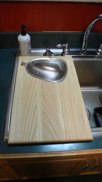 Router hacia fuera tablero donde se encuentra con los labios de la pileta, a permanecer en el lugar y no caer en el fregadero. Tablero de arena con el grano. Condición de madera con carniceros bloque aceite. Vaya cosas de picar.