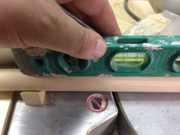 Ahora las cosas se ponen un poco difíciles, ya que las patas de la mesa ellos mismos son cónicos, sólo les golpeándose contra la parte posterior de la guía lateral dará lugar a una pata de la mesa con un pequeño ángulo en la parte superior, que no es bueno para lo que necesitamos. Así que coge algunas cuñas y su nivel de burbuja pequeña y suplementar su pata de la mesa hasta su nivel. Que se encarga de un eje, ahora tenemos que afrontar Y, en su mayor parte el cono en estas piernas no empieza realmente hasta una pulgada o tan abajo desde el punto de montaje. Así de puede engañar y sujete la parte superior de la pierna contra la valla, con una buena cantidad de presión. Esto tirará la parte inferior de la pierna hacia fuera de la cerca y debe alinearse lo suficientemente cerca como para hacer el corte. Todavía puede tener un ligero ángulo en la parte superior de la pierna cuando haya terminado, pero podemos tomar distancia con lijado.