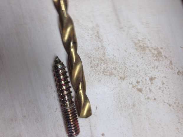 Entonces lugar uno del tornillo roscado de extremos abajo en la mesa pone la broca de 1/4 al lado de él y marca con el lápiz la profundidad tendrá que perforar, asegurándose de dejar suficiente hilo en la parte superior para atornillar la placa de montaje.