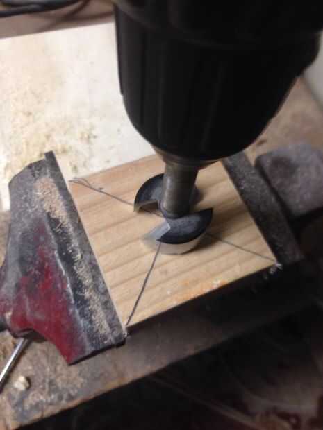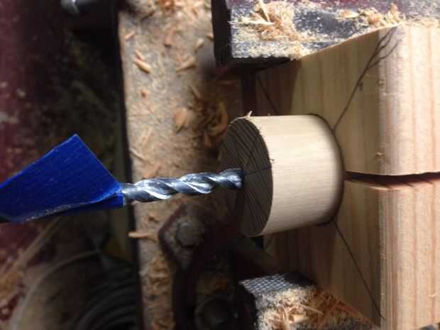 Para agarrar un trozo de 2 x 4 lo enfrentarán, conectar las esquinas con una línea de lápiz para encontrar el punto central. Pegúelo en la prensa y con una broca Forstner o una punta de pala. El tamaño de la broca sólo importa en eso su suficientemente grande como para caber la parte más pequeña de la pierna cónica, idealmente usted quiere algo que se ajusta el extremo más grande de su corte hacia abajo de la pierna, para facilitar las cosas, pero no todo el mundo tiene una 1 1/2" Forstner pero más espada pedacito kits vienen con por lo menos a 1" las cosas que funcionarán igual de bien.