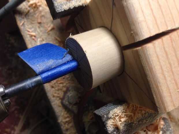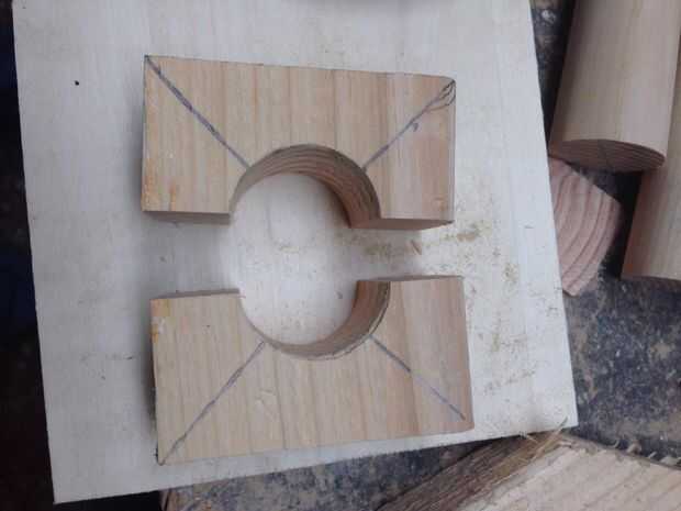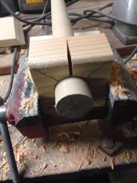 Una vez que ha cortado el orificio, apoderarse para su sierra de ingletes y corta por la mitad, envolver cada mitad alrededor de la pata de la mesa y coloca en el vicio, alinee la broca en el centro y perfore los agujeros.