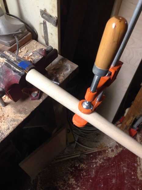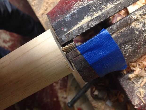 Ahora acaba de tomar la pata de la mesa y tighty diestro que en la rosca de tornillo gruesa expuesta. Usted puede hacer esto a mano, pero una vez usted bajar profundo va para ponernos muy duros y te va a dar sus antebrazos un trabajo. Para hacer esto más fácil y si tienes un mediano colocación de abrazadera alrededor de la barra. Tomar y apretar hasta la pata de la mesa, le dan un toque muy bueno, no te preocupes que no debe dañar la pierna, pero si quiere puede utilizar la misma plantilla que usamos para sostener en el vicio aquí así, y dar es una vuelta hacia abajo en el extremo extendido de la abrazadera. La longitud de la abrazadera reducirá significativamente la cantidad de fuerza que necesita ejercer a rosca en los tornillos de montaje.