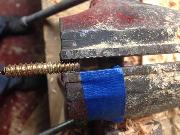 Una vez que las piernas se perforan, coloque sus tornillos roscados en el vicio, recuerda a sus roscas dañadas en el mismo lugar como estaban la última vez. Esto realmente ayudará a mantenerlos en su lugar puesto que da el vicio algo aferrarse a algo entonces pela a nuevos subprocesos.