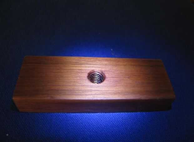 Hay varias maneras de colocar los sujetadores de metal roscados en accesorios de madera. Por ejemplo, insertos y tuercas en t se pueden utilizar para agregar una conexión roscada a un jig. Pero a menudo prefiero perforar y grifo rosca directamente en el accesorio de madera. Muchas maderas duras pueden ser perforadas y golpeado ligeramente, sin embargo maderas blandas carecen de la necesaria manejabilidad y capacidad de retención. La mejor madera que he utilizado para el roscado es Jatoba, (cereza brasileña). Jatoba es muy densa, de grano duro, fino y muy bien los hilos de rosca. Roble y Padauk son finos también. Encontrar estos accesorios roscados de madera sujetar un tornillo extremadamente bien.