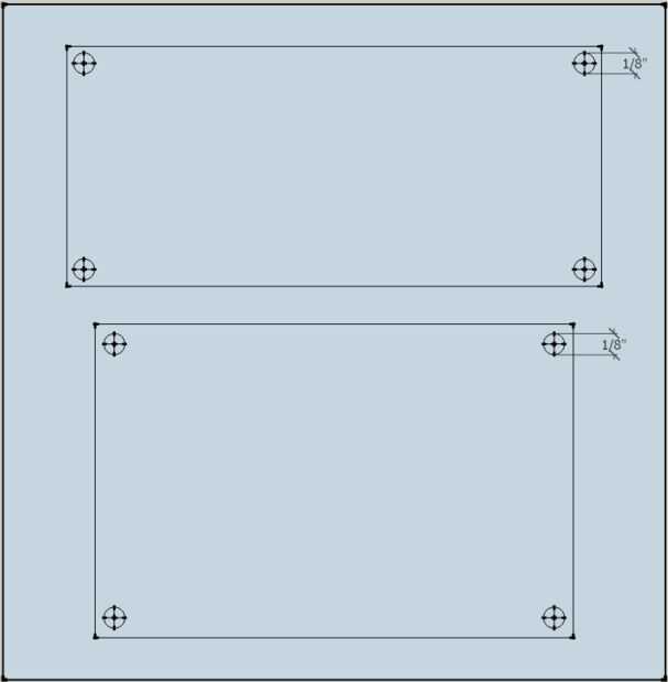 Una de las claves aquí es cuando usted pone hacia fuera donde están los agujeros, hacer líneas de "Cruz" a través de los centros. Ver la imagen adjunta para ver un ejemplo. Esto hará que la alineación de la broca mucho más fácil. También es una buena idea poner marcadores de dimensión en el dibujo para los tamaños del agujero, sobre todo si tienes agujeros de tamaños diferentes. No cuesta nada hacerlo, y será un buen recordatorio cuando se taladre.