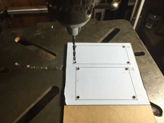Tome la broca más pequeña, 1/16 de pulgada es generalmente bastante buena aquí. Cuidadosamente alinee con la marca "Cruz" en el dibujo. Si trabaja en metal, haga una marca con un punzón antes del primer bit para localizar aún más precisas del agujero. Taladre el agujero. Si no está usando una prensa del taladro, sujete el taladro lo más recto posible.